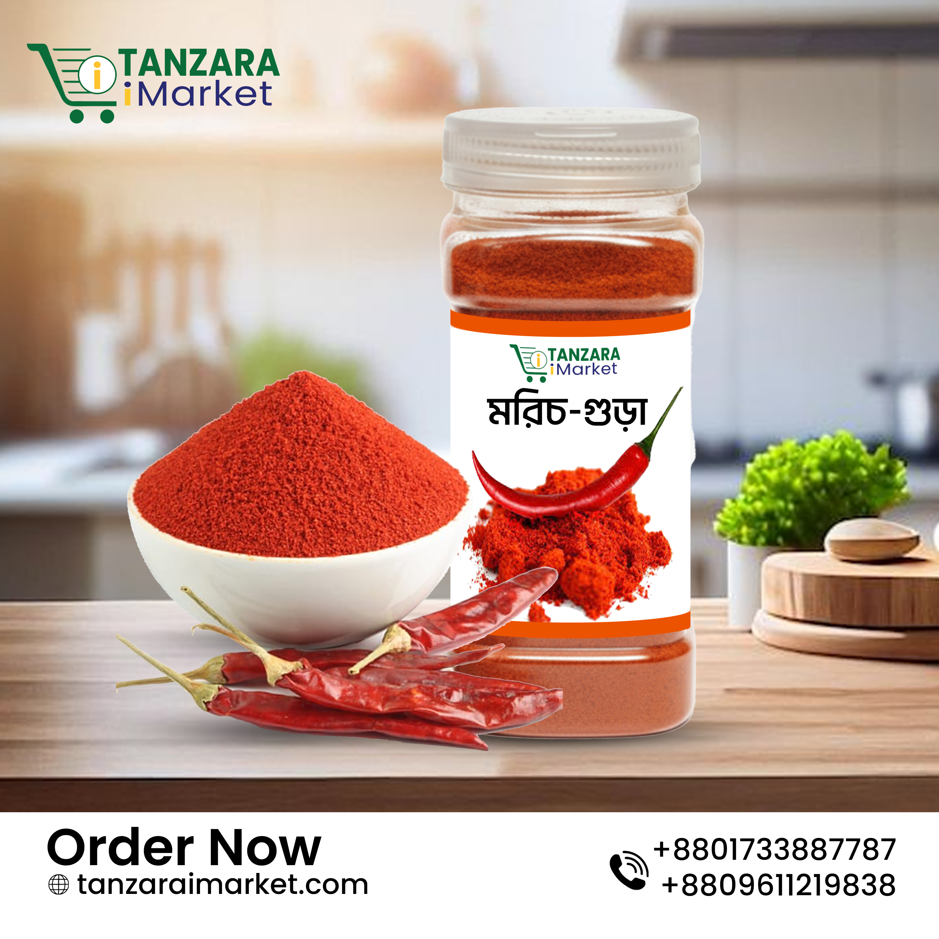 🌿 উপকারিতা: ক্ষুধা বাড়াতে সাহায্য করে মেটাবলিজম বৃদ্ধি করে ভিটামিন A ও C সমৃদ্ধ 🍽️ ব্যবহার: 🌿 উপকারিতা: হজমে সহায়তা করে গ্যাস ও অম্বল কমায় শরীর ঠান্ডা রাখতে সাহায্য করে 🍽️ ব্যবহার: 🌿 উপকারিতা: হজম শক্তি বৃদ্ধি করে পেটের সমস্যা কমায় আয়রন সমৃদ্ধ 🍽️ ব্যবহার: 🌿 উপকারিতা: রোগ প্রতিরোধ ক্ষমতা বাড়ায় শরীরের প্রদাহ কমাতে সাহায্য করে ত্বক উজ্জ্বল ও স্বাস্থ্যকর রাখে হজম শক্তি উন্নত করে 🍽️ ব্যবহার: তরকারি, ডাল, মাছ, মাংস ও ভাজি রান্নায়🌶️ লাল মরিচ গুঁড়া (Red Chili Powder)